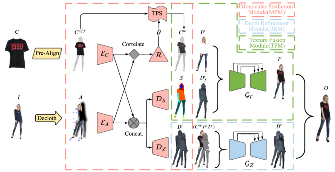 M3D-VTON 主要包括三个模块,如图2所示,分别是(1)单图预测模块(Monocular Prediction Module,MPM),(2)深度优化模块(Depth Refinement Module,DRM)和(3)纹理融合模块(Texture Fusion Module,TFM)。整个框架的输入是一张目标衣服图像