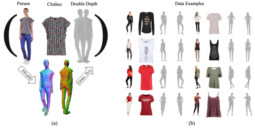 上述提到 M3D-VTON 是第一个尝试解决从单图到三维的虚拟试穿问题,现有数据集并不能满足模型的训练需求。因此我们基于二维试穿数据集 MPV [11] 构建了一个新的合成数据集,称为MPV-3D。MPV-3D 在 MPV 的基础上对每个人物图像添加了相对应的正背面深度图