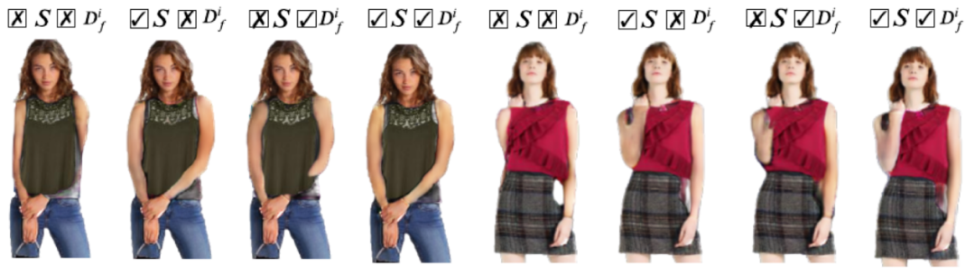 图3展示了自适应预对齐的可视化消融实验图,可见带有预对齐的 TPS 能够更容平滑且更准确地将目标衣服变形到参考人物相应位置上。