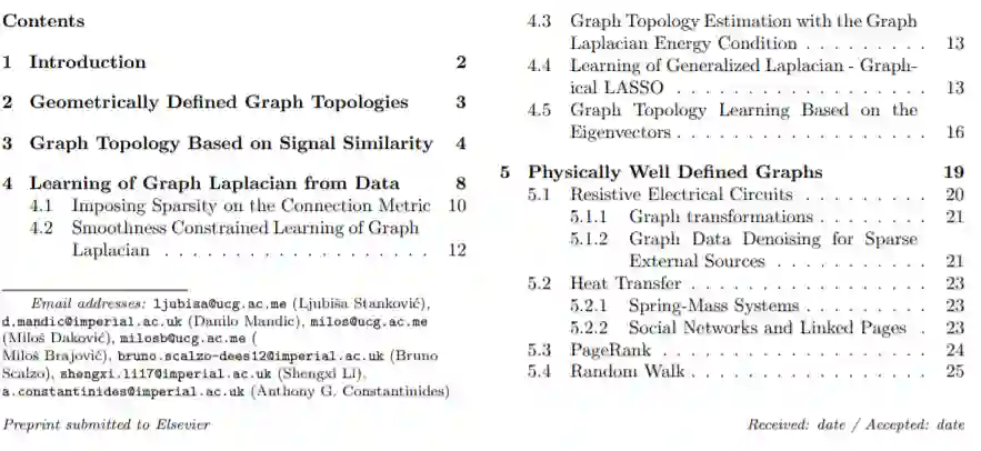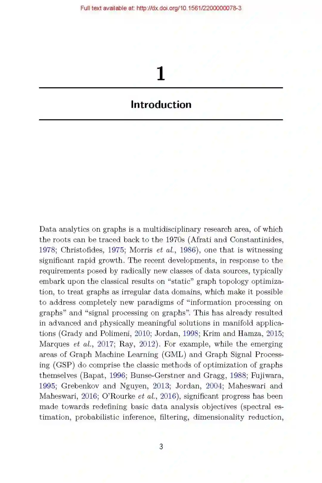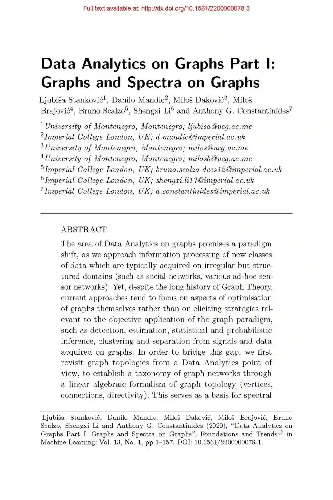 作者从现代数据分析的角度重新审视了图拓扑,并着手建立图网络的分类。在此基础上,作者展示了频谱分析如何引导最具挑战性的机器学习任务,如聚类,以直观和物理上有意义的方式执行。作者详细介绍了图数据分析的独特方面,例如它们在处理从不规则域获取的数据方面的好处,它们通过局部信息处理微调统计学习过程的能力,图上的随机信号和图移位的概念,从图上观察的数据学习图拓扑,以及与深度神经网络、多路张量网络和大数据的融合。包括了大量的例子,使概念更加具体,并促进对基本原则的更好理解。