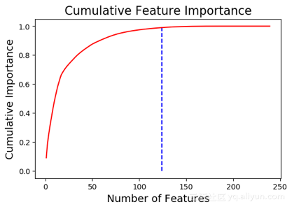 左边是关于plot_n最重要特征的图(根据归一化的重要性所绘制,总和为1)。右边是累积重要性与特征数量的关系图。垂线画在累积重要性达到的阈值处,本例中阈值为99%。