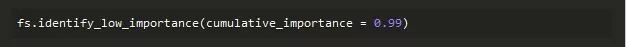 这种方法构建立在零重要性函数的基础上,再利用模型中的特征重要性进行进一步的选择。由函数identify_low_importance可知,低重要性特征并不影响某些指定的总重要性。