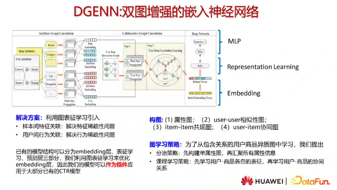 已有的CTR模型的范式可以分为embedding层、表征学习、预测层三部分。我们利用图表征学习来优化embedding层,所以DGENN可以作为插件应用与大部分已有的CTR模型。具体地,我们构建了一张异质图,包括user和item的属性图、user-user相似性图、item-item共现图以及user-item的协同图。为了从包含各类关系的异质图中学习出一个好的表征,我们提出了分治策略和课程学习策略。前者先构建单属性图,再汇聚所有属性信息;后者考虑到行为之间的关系复杂性,先学习用户、商品各自的表征,再学习用户-商品的协同关系。