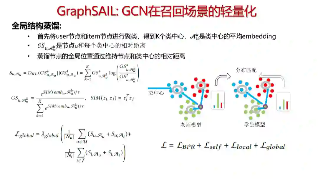 第三,我们考虑了全局结构的蒸馏,旧模型和新模型的embedding在空间中的分布位置不应该偏离太远。首先将user节点和item节点进行聚类,得到K个类中心以及对应的平均embedding;然后我们计算每个节点和类中心的相对距离。蒸馏节点的全局位置通过维持节点和类中心的相对距离,使得增量学习的新模型在全局结构上不会大幅偏离旧模型。