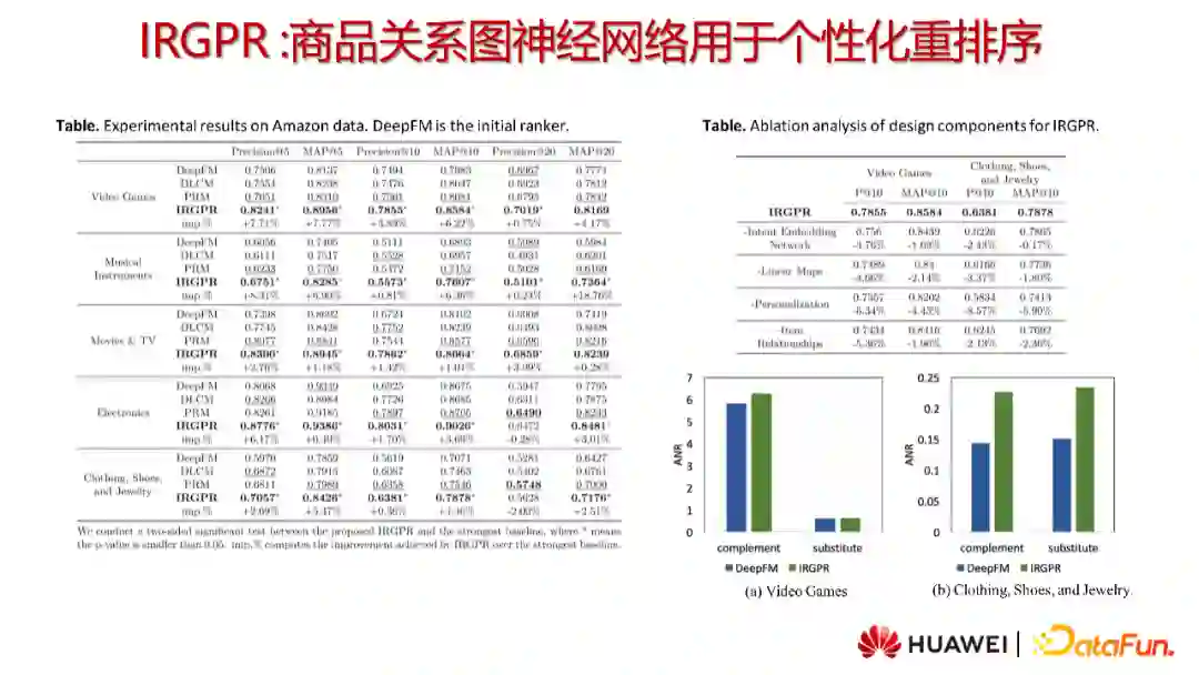 其中,AB和BT为互补关系,AV和BV为可替换关系。从实验结果来看,我们的方法的表现均超过了基线模型;消融实验也表明去掉模型的用户表征、线性表换、商品之间的互补/可替换关系均会使效果有所下降,进而证明了各模块的有效性和必要性。