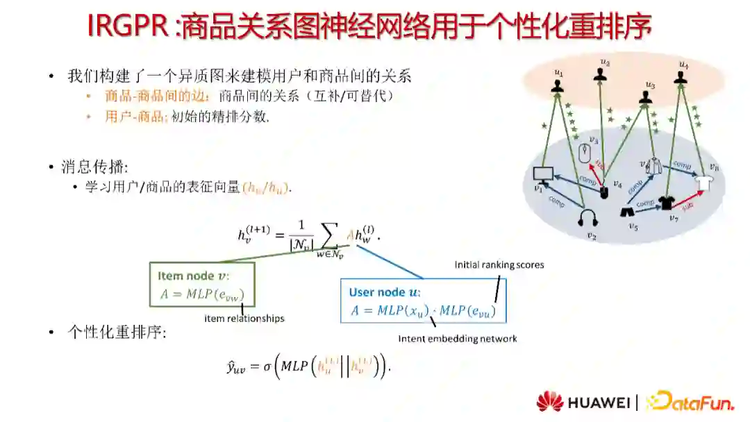 图神经网络可以建模商品之间的关系,因此可以被用于个性化重排序。我们构建了一个由用户节点和商品节点组成的异质图来建模用户和商品间的关系。图中有两种类型的边。我们使用商品间的关系(互补/可替代)来建模商品-商品间的边,使用初始的精排分数来建模用户-商品间的边。GNN中的消息传播机制需要学习用户/商品的表征向量。在汇聚商品节点信息时,我们考虑了商品之间边的类型(即商品之间的关系);而在汇聚用户节点信息时,我们不仅加入了用户的边类型(即排序分),还考虑了用户自身的表征来建模用户个性化信息。最后,我们根据网络生成的打分进行个性化重排序。