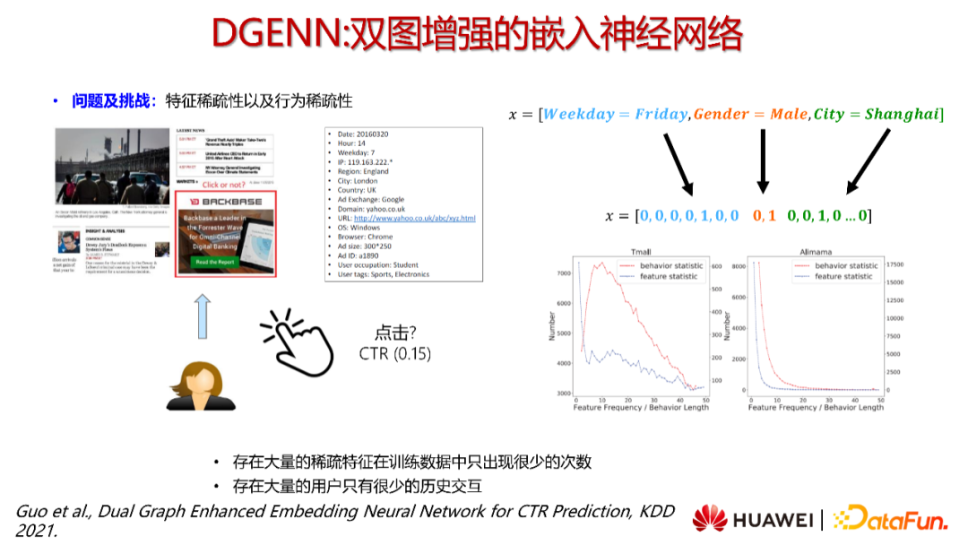 但是已有的CTR预估模型存在两个问题:特征的稀疏性以及行为的稀疏性。在真实的业务数据上,我们发现它们大多服从长尾分布,即存在大量稀疏特征,在训练数据中只出现很少的次数,存在大量用户只有很少的历史交互。那么此时,基于用户历史行为进行建模是很难得到很好的效果。基于此,我们考虑使用GNN引入特征之间的关系和行为之间的关系来增强样本。