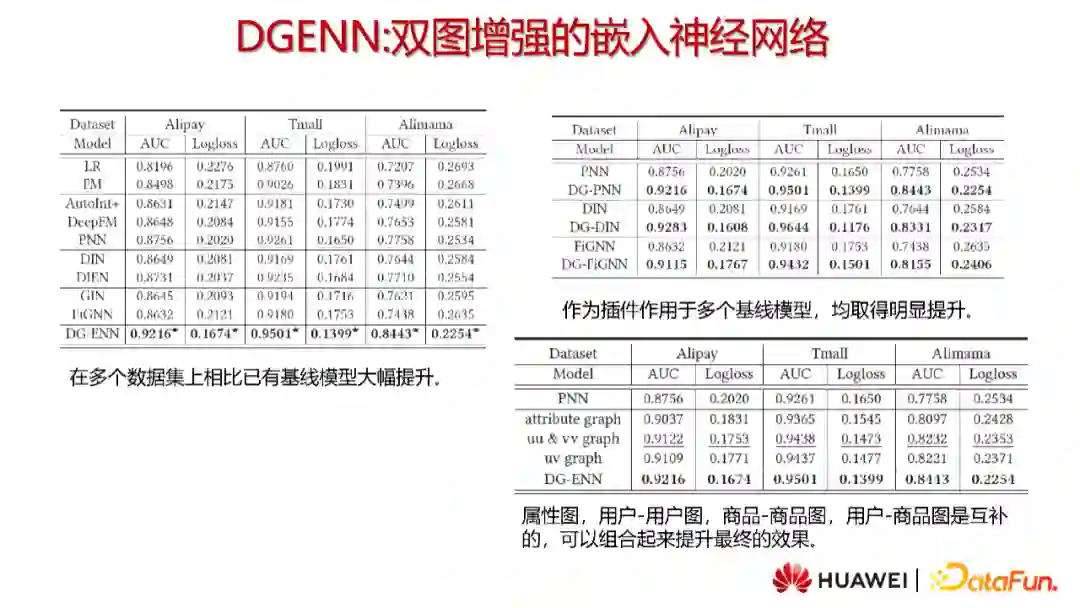 上图展示了实验结果,我们的方法在多个数据集上相比已有的基线模型有了大幅提升。其次,我们将DGENN作为插件作用于多个基线模型(PNN、DIN、FiGNN),均取得了明显的效果提升。消融实验也表明四种不同的图之间是互补的,组合起来可以提升最终的效果。