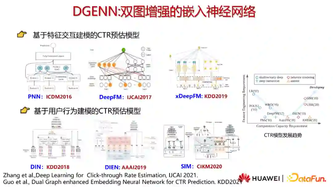 在DGENN之前,CTR预估模型可以分为两大类。首先,基于特征交互建模的CTR模型的代表作为PNN,DeepFM和xDeepFM。第二类是基于用户行为建模的CTR预估模型,如DIN,DIEN和SIM。CTR模型的趋势是向着越来越复杂的数据的方向来发展,越来越多模型使用检索的机制来找到用户历史行为中有用的信息来建模,即通过寻找越来越复杂的特征来提升效果。