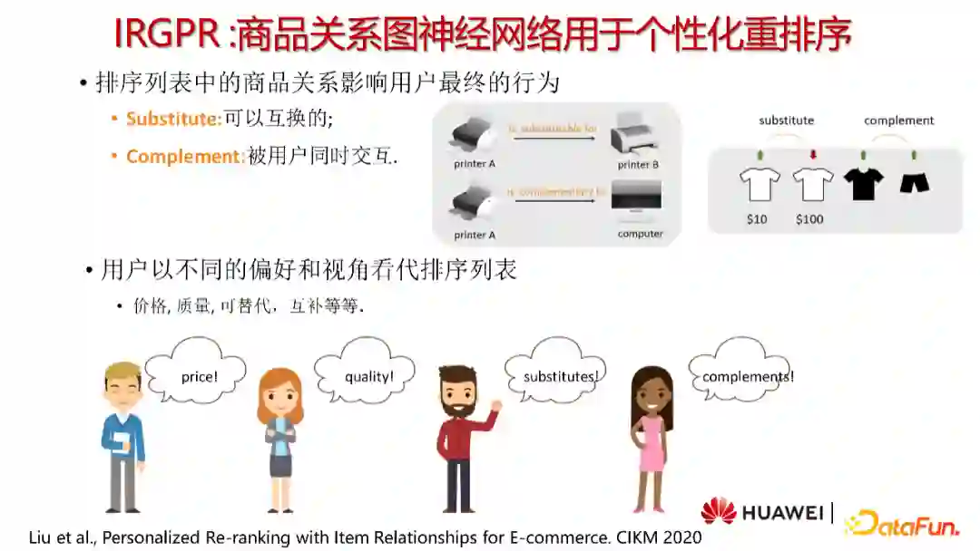 在重排序阶段会存在一个待排序列表,由于排序阶段得到的排序分是pointwise的预测方式,没有考虑到商品间的关系,直接给出这部分预测结果可能无法满足用户的真实需求。排序列表中的商品关系会是可以互换且被用户同时交互的(例如互补关系),用户也会以不同的偏好和视角来看待排序列表。通过考虑商品间的关系,我们可以将更好的推荐结果返回给用户。