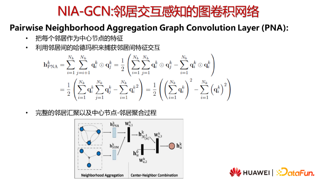 首先,我们引入了邻居的交互,将每个邻居作为中心节点的特征,利用邻居间的哈德玛积来捕获邻居间的特征交互。其中,在计算哈德玛积时,我们借鉴了FM的做法,其时间复杂度可以有效地被降低。上图下侧展现了完整的邻居汇聚以及中心节点-邻居的聚合过程。首先,每一对邻居之间都会进行交互,考虑了一阶(求和)和二阶(哈德玛积)关系,之后对它们进行一个变换得到邻居汇聚的表征;在下一阶段,华为将邻居汇聚表征和中心节点表征进行组合,最终得到聚合特征。