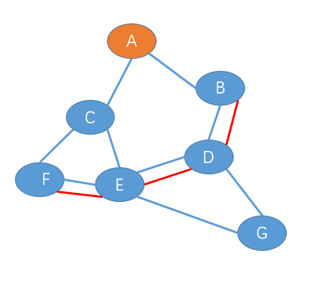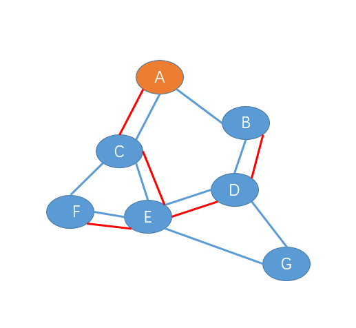 1. F 节点给 E 发送加入树报文,此时 E-F 链路成为初始生成树,如下图(红色路径表示生成树)。