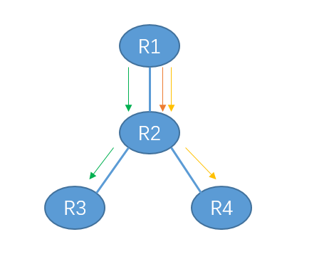 途中不同箭头的颜色表示 R1 给不同的节点发广播分组。