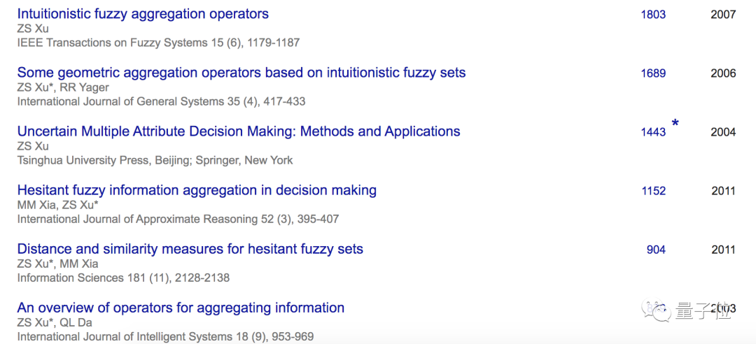 徐泽水教授引用数最高的几篇论文,集中在系统工程、模糊数学、信息科学领域。