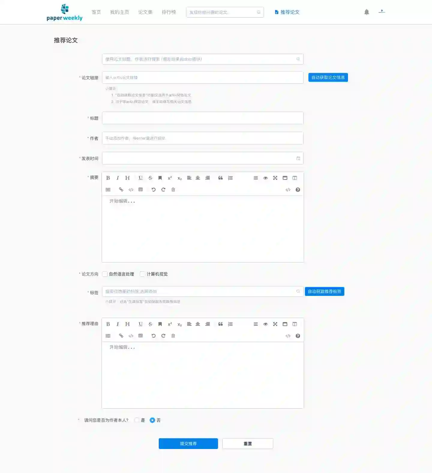 我们针对 arXiv 做了一个工具,当你从搜索框中搜索感兴趣的作者或标题时,我们会将 arXiv 的结果反馈给大家,然后点击自动获取论文信息,将会补全本篇 paper 的所有 meta 信息。
