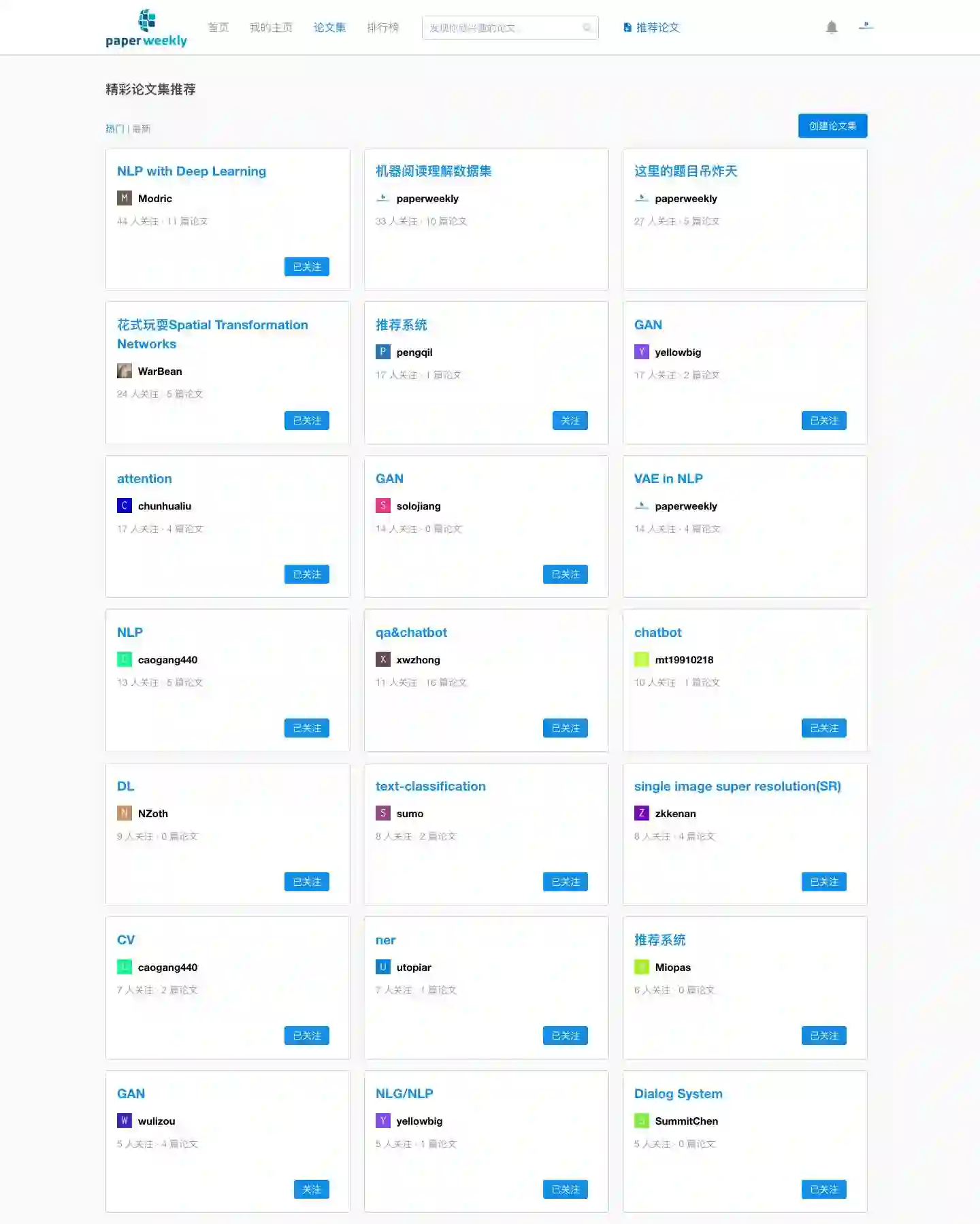 大家自发地建立了很多的论文集,很多其实都是在占坑,还没有太多的内容填充进来。这类论文集的关注量并不多,而有的论文集已经将几篇高质量的 paper 收录进来,并且得到了大家的广泛关注。