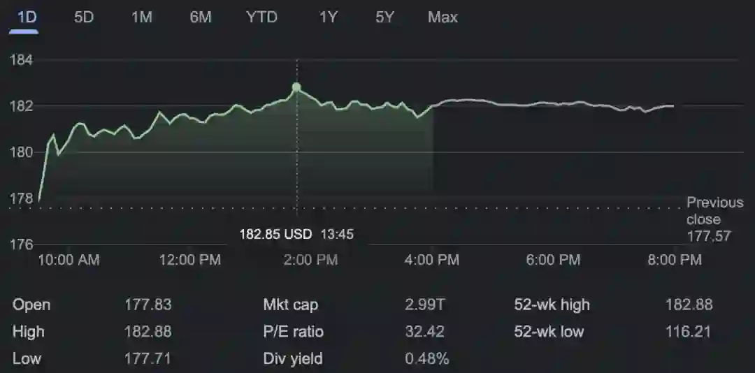 虽然后续有所回落,并收于182.01美元。苹果最终的市值依然上涨了2.5%,达到2.98万亿美元。