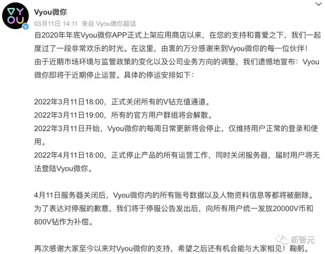 今年3月,官方发表声明称,「由于近期市场环境与监管政策的变化以及公司业务方向的调整,我们遗憾地宣布:Vyou微你即将于4月11日关服。」