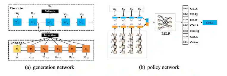 作者的对话模型由策略网络和生成网络两部分组成,首先历史聊天记录通过策略网络来挑选对话类别,然后基于聊天记录和对话类别通过生成网络进行对话。对话模型公式: