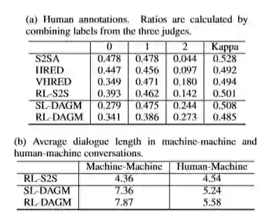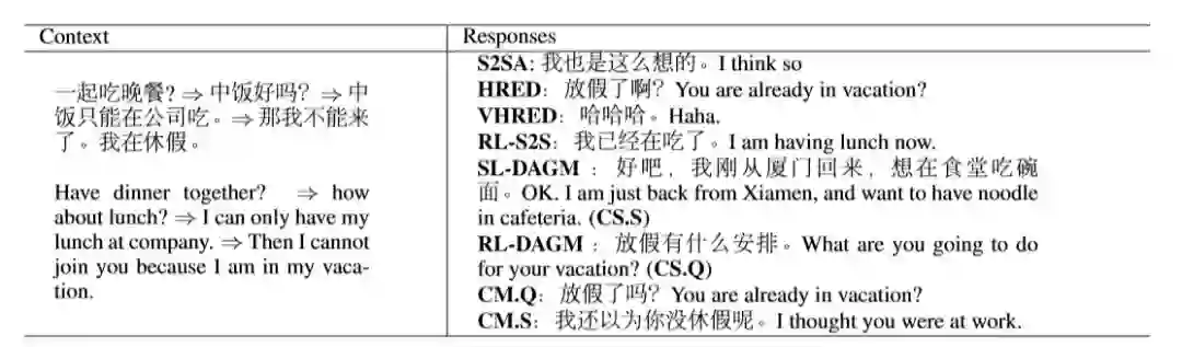 为了测试 模型的效果,作者将每组对话的最后一句作为背景,将历史对话输入到不同的模型中,作者并对输出的回答分为3个等级,以此来直观的评判模型的效果。等级2:回答的句子不仅相关性强,而且内容有趣;等级1:回答勉强可以,但没有足够的信息;等级0:回答毫无意义,或者无法错误。评估结果如下: