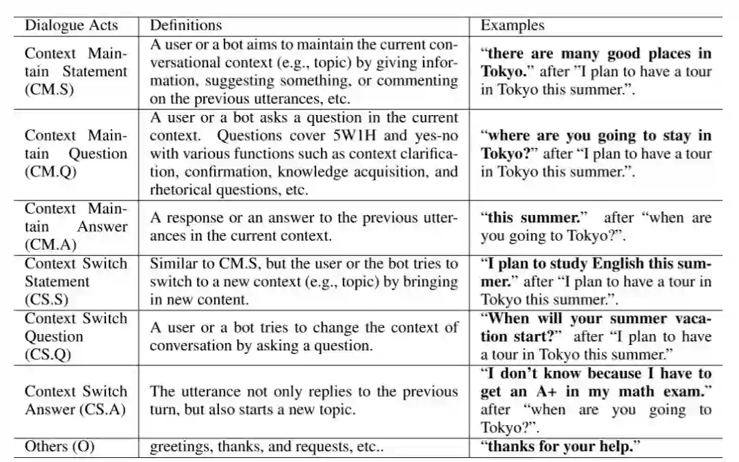 在阐述模型之前,先说一下作者在模型中使用的分类器。作者通过一个分类器将对话进行了分类,类别在实验部分的数据集内有简单介绍,分类器的实际例子如下所示:
