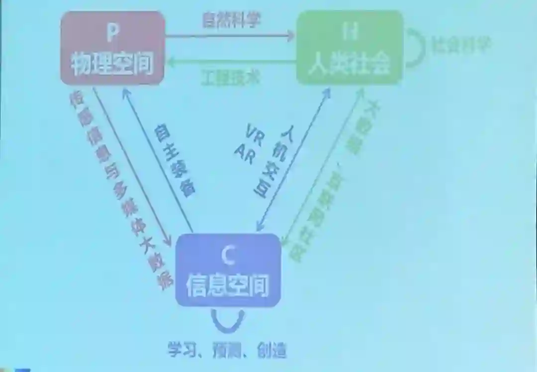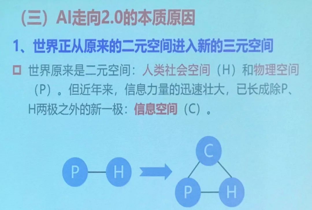 以前的世界是二元空间,一元是人类社会空间(Humansociety space),一元是物理世界(Physical space);但过去30年,世界正在形成一个新的空间——信息空间(cyberspace)。我们的世界正从原来的PH两元空间变成了一个CPH三元空间的构成。