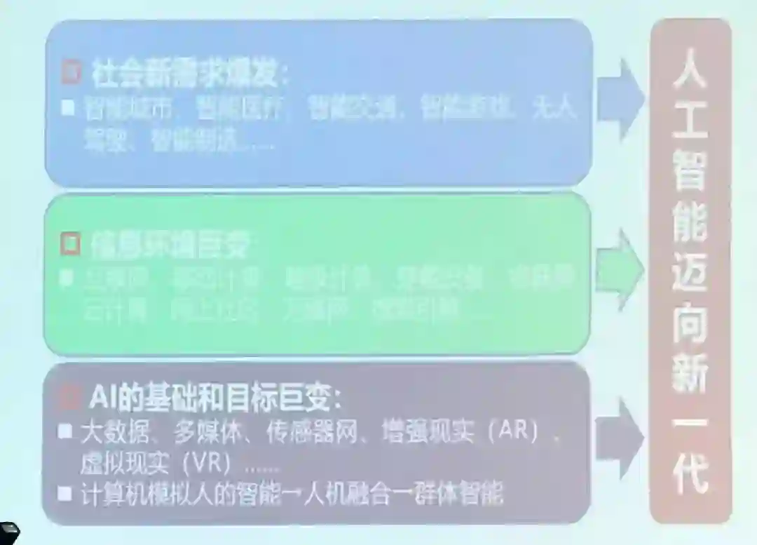 潘云鹤院士指出,从2015年起,由于 1)社会新需求爆发;2)信息环境巨变;3)AI的基础和目标巨变,人工智能由此走向了2.0阶段。正是基于这种认识,国家在2017年发布了《新一代人工智能发展规划》,提出了五大人工智能发展技术方向:大数据智能、群体智能、跨媒体智能、人机混合增强智能和自主智能系统。