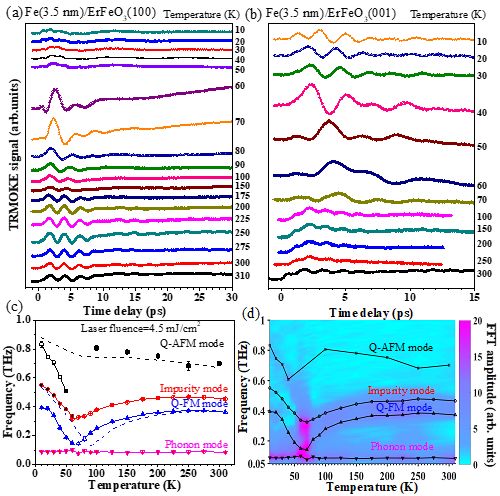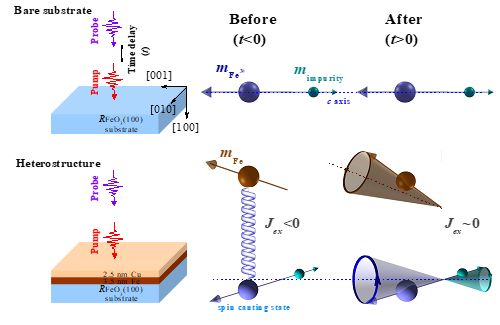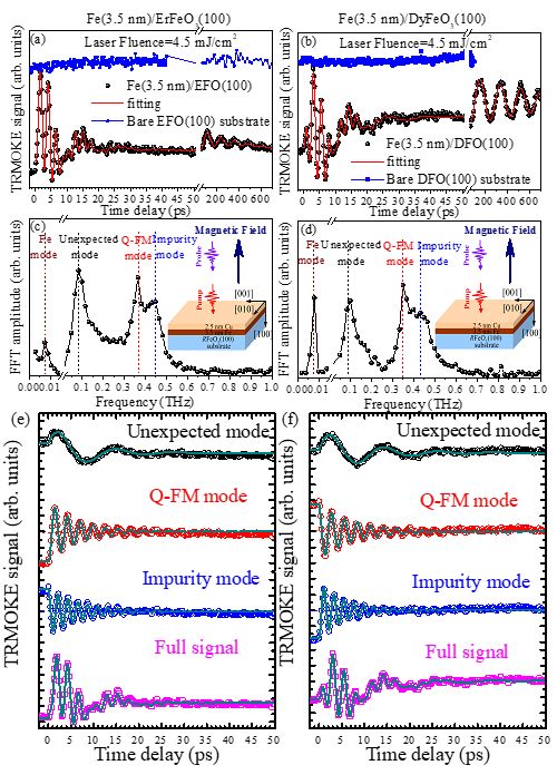 脉冲激光诱导的超快自旋动力学可为研究反铁磁材料提供一个强有力手段,超快脉冲激光泵浦探测(pump-probe)的方法由于具有飞秒时间分辨,可在磁性薄膜超快自旋动力学的研究中得到广泛应用。稀土正铁氧体晶体(orthoferrite)RFeO3(R=Tb, Dy, Ho, Er, Dy, Yb或Y离子) 由于具有复杂的倾斜G型反铁磁结构和强的自旋-轨道-晶格之间的耦合,表现出独特的磁光效应。近年来,超快光磁激发和多铁性等工作中取得的新进展又激发了人们重新研究稀土-铁氧化物的超快磁光效应。