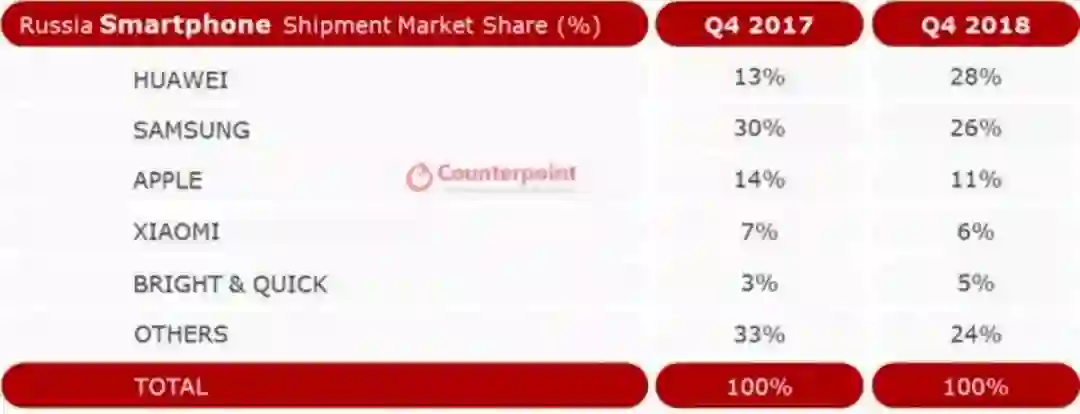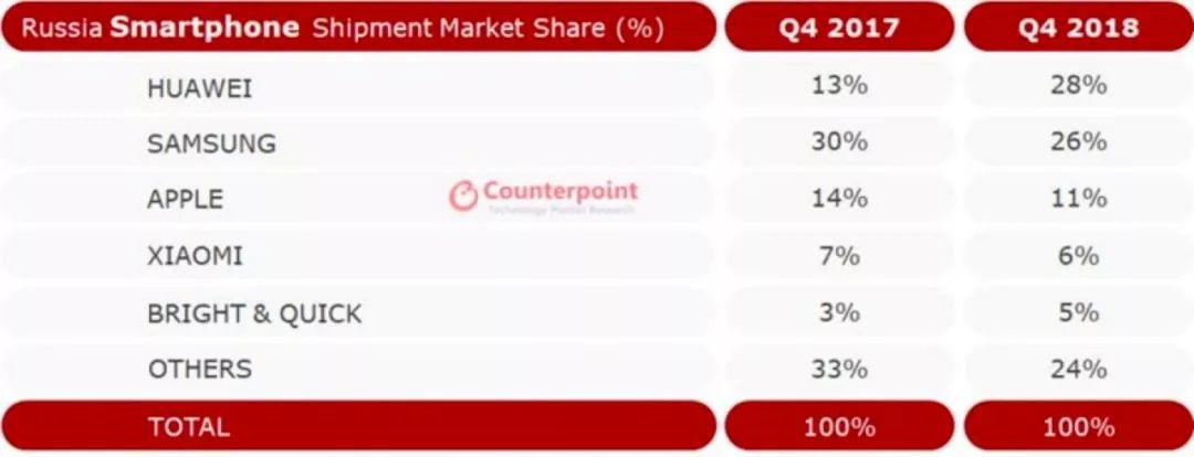 Counterpoint Research的最新研究数据显示,2018年Q4,华为集团(含荣耀)在俄罗斯智能手机市场的市占率为28%,手机销量同比增长91%。此外,俄罗斯Q4智能手机销量同比下降11%,首次出现萎缩。
