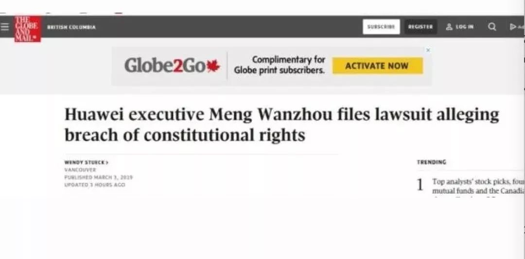 加拿大时间2019年3月1日,律师代表孟晚舟女士向加拿大不列颠哥伦比亚省最高法院提交了一份针对加拿大边境服务局、加拿大皇家骑警和加拿大政府的民事诉讼通知书。诉讼书称,孟女士宪法权利遭到严重侵害,2018年12月1日孟女士在温哥华国际机场被拘留、搜查、审讯时,加拿大政府官员多次违反法治,就公职人员渎职和非法监禁寻求损害赔偿。起诉书中已说明了相关情况,案件正在法院审理中,目前没有进一步评论。
