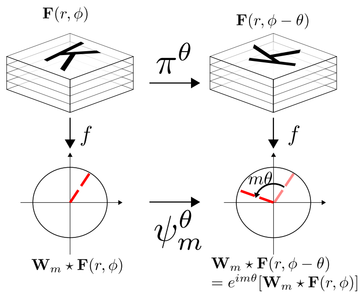 顺序m下的两个响应也保持m的顺序。所以要创建一个CNN,其中的输出与输入的旋转是M对等的,我们需要: