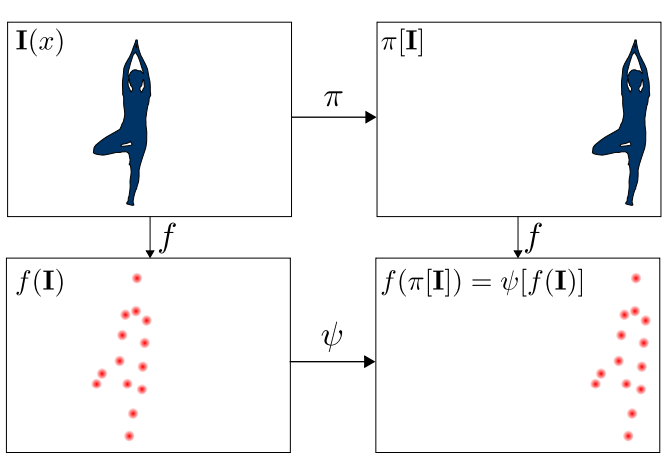 等变性是非常有用的属性,因为输入图像的变换π可以生成可预测的特征变换ψ,这些特征是可解释的,并且能让学习变得容易。用公式来表示,即如果我们可以将输入x∈X的每个变换π∈Π与ψ∈Ψ相关联,那么f:X→Y就等价于一组变换。即: