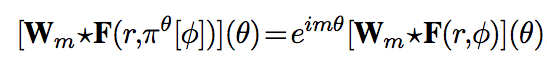 假设将一个顺序为m的圆形谐波与旋转后的图像补丁相关联,补丁在原始滤波器处只能做局部旋转。这意味着互相关联的响应仅仅是输入图片补丁旋转θ的标量函数,并且这种响应很复杂。利用文中第一个公式,结合极坐标系,图像F(r,φ)对于原始滤波器旋转θ角度后得到的是F(r,φ−θ),所以旋转变换过程可以被写成F(r,πθ[φ])=F(r,φ−θ)。结果可以表示为: