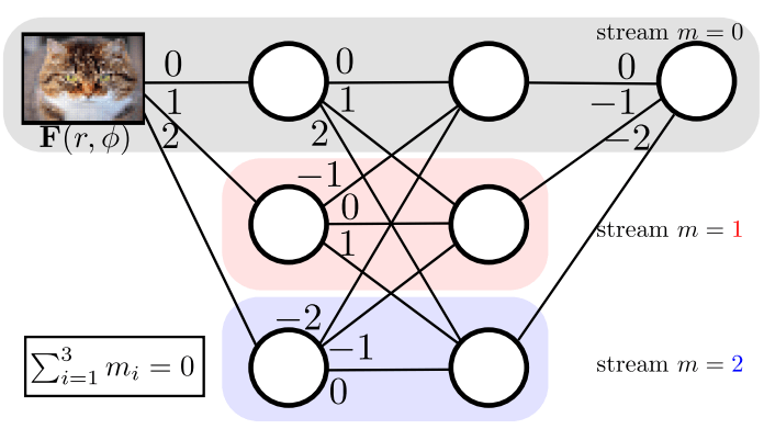 这就是一个有两个隐藏层的H-Net示例,其中输出的m=0。每个横条代表一系列的特征映射,线条表示它们之间的关系,并且表明了对应滤波器的旋转顺序。