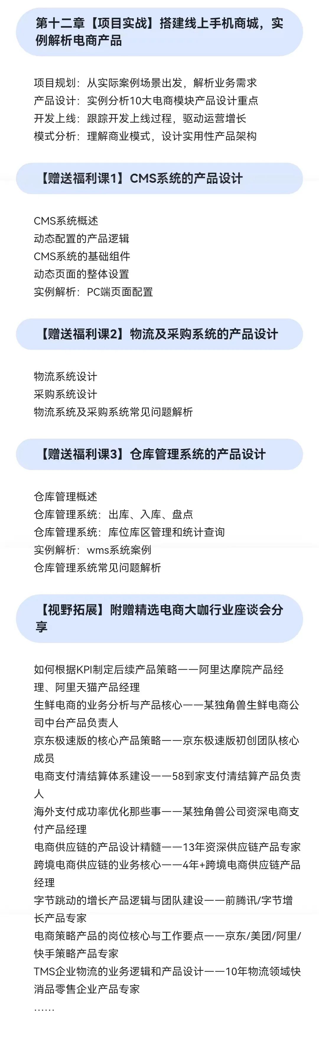 当前网上关于产品的文章主要偏向方法论、业界动向、产品分析、用户体验等,关于电商系统的文章和课程非常少,并且不系统,质量参差不齐。