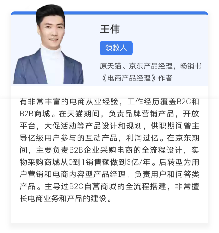 以及出版了业内第二本电商产品书籍——《电商产品经理》,且垂直领域销量Top 2,前京东/天猫产品经理,受到《淘宝十年产品事》作者苏杰、36氪产品总监申悦等大咖肯定的@王伟 老师。