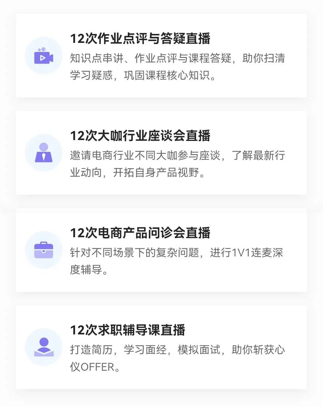 除了全套电商体系课,课程还包括全年 48 场直播(可与导师连麦),帮你解决学习、工作、求职过程中的个性化问题。