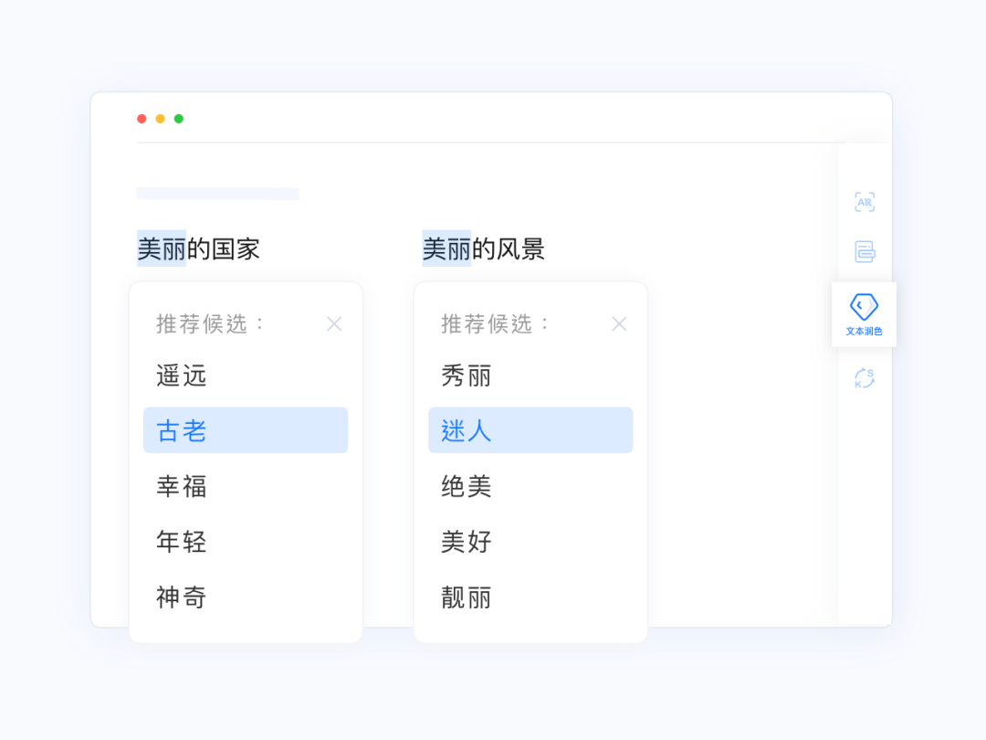 不同于简单的同义词替换,文涌的短语润色服务能够结合当前短语的上下文信息,提供满足当前语境的合理润色方案。如下图所示,「美丽」一词在不同的语境中,短语润色给出不同结果。在关联上下文的基础上,文涌短语润色功能的触发率高于大多数同类系统,即文涌能够对句子中更多的短语给出润色结果。