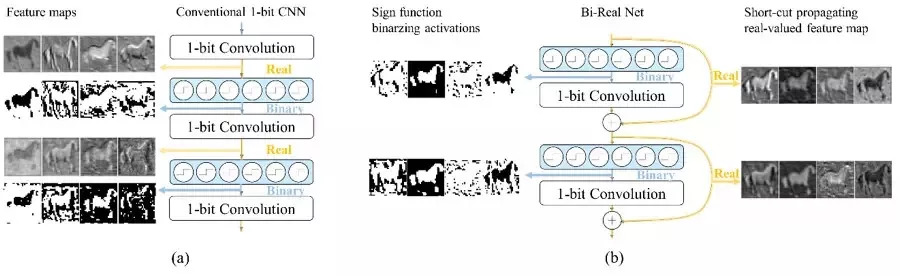 左图是传统神经网络,连续灰度的特征图每次经过 1-bit 卷积的时候,都会被二值化。所以我们提出在特征图在被二值化之前,利用 shortcut 来传递这些实数值的特征图,这样就可以大大地保留网络中的信息量,提高网络的表达能力。