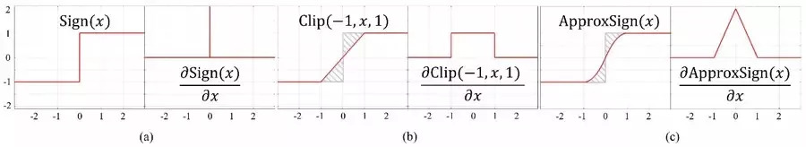 (1)在对激活值求导的时候,由于二值化激活值的 sign 函数不可导,所以在前人(Binary Net)采用的方法是利用 clip(-1,x,1) 的导数来拟合 sign 的导数,但是这样造成的效果就是,网络在正向计算 loss 的时候所看到的是一个以 sign 为非线性函数的网络,而在反向计算 gradients 的时候是根据一个以 clip 为非线性函数的网络进行计算的。由于 clip 函数与 sign 函数有差距,这种计算方式会带来所谓的导数值不匹配的问题。基于这个,我们提出用二阶拟合 sign 的 ApproxSign 的导数来作为 sign 的导数,从而缩小导数值的不匹配问题。这个带来了约 12% 的性能提升。