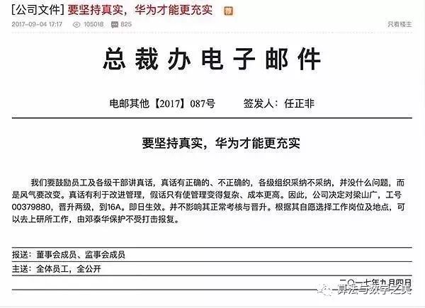 前不久,华为一份总裁办电子邮件从内部流出,引发强烈的舆论反响。一位名为“梁山广”的华为员工,冒着“混不下去”的风险,揭发了所在部门的造假行为,出其意料的是,最后他被任正非破格提拔两级。为免其在公司内部受到打击报复,任正非还指定华为无线产品线总裁邓泰华对其进行保护。