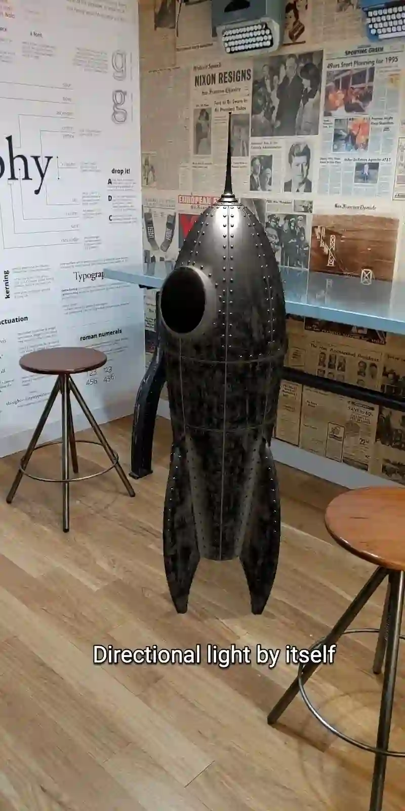这是两个相同的虚拟火箭。左图中,火箭下方有一个阴影,其方向与其他的阴影方向不一致。反观右图,火箭的阴影方向与其他阴影方向完全一致。两张图的差别虽然很细微,却是至关重要的。因为当火箭的阴影方向与环境中其他物体的阴影方向一致时,才能达到火箭真的放置在地上的效果,增加数字对象在现实环境中的真实性。