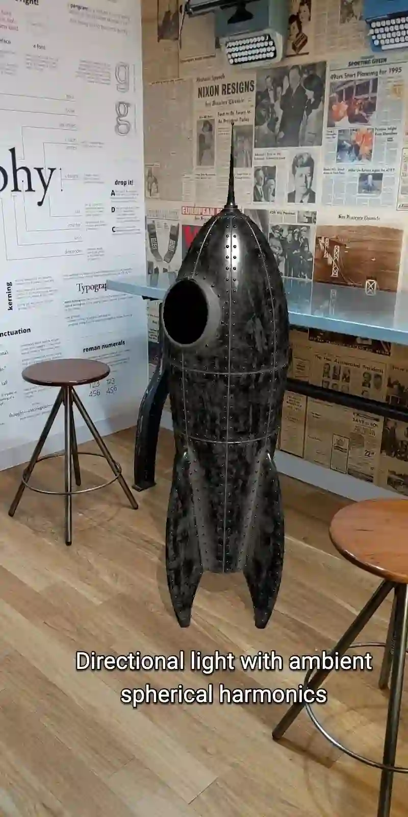 下图是在不同光照环境下的同一枚火箭模型。所有这些场景都是通过三个 API 渲染得出的,并使用了定向阴影。