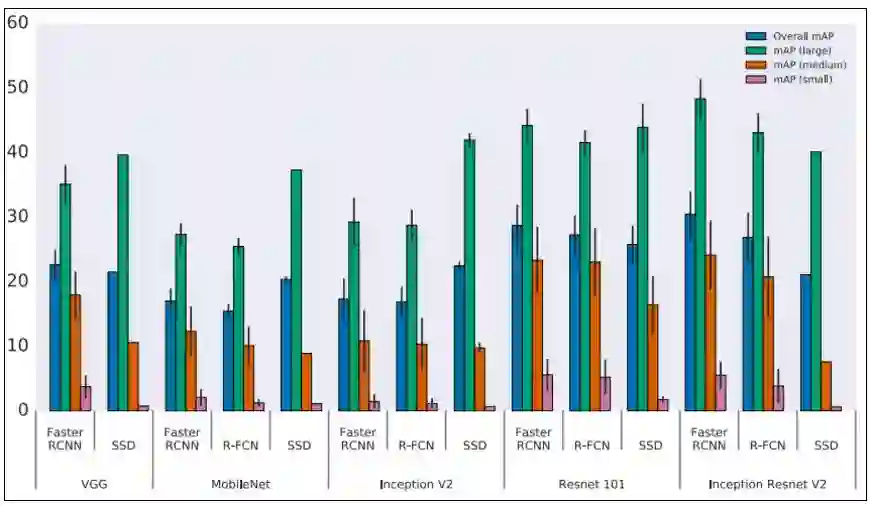 注意:Y 轴表示的是平均准确率(mAP),X 轴表示不同元架构(meta-architecture)的各种特征提取器(VGG、MobileNet...Inception ResNet V2)。此外,mAP small、medium 和 large 分别表示对小型、中型和大型目标的检测平均准确率。即准确率是按「目标尺寸、元架构和特征提取器」进行分层的,并且图像的分辨率固定为 300。虽然 Faster R-CNN 在上述样本中表现得更好,但是这并没有什么价值,因为该元架构相比 R-FCN 来说慢得多。