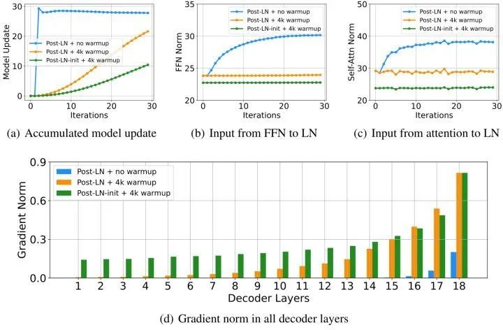 接下来作者通过一系列实验,从实验的角度验证 Post-LN 的不稳定性来自一系列的问题。