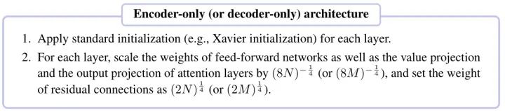 研究者将此模型命名为 Post-LN-init。注意到 这个值是随着层数的增加而越来越小的,也就意味着对于浅层而言,权重进行 downscale 的比例较大,对于深层而言,权重进行 downscale 的比例较小。此外,Post-LN-init 与 Post-LN 具有相同的架构,从而消除了架构的影响。