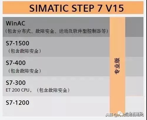 1.SIMATIC Step 7:可以对S7-1200/1500,S7-300/400系列PLC进行编程。Step7 包括两个版本:基本版(Basic)和专业版(Professional)。基本版只能对S7-1200系列PLC进行编程组态,而专业版可以对S7-1200/1500,S7-300/400及WinAC进行组态和编程。