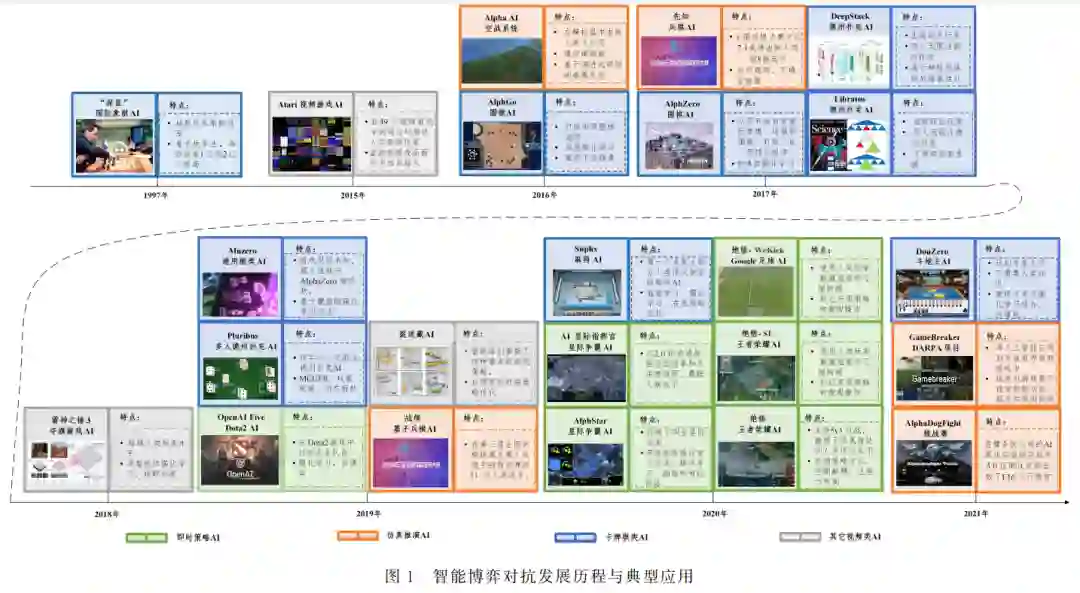 博弈对抗不断推动着智能水平的发展,对抗场景从早期 的“图灵测试”到目前的“通用场景”探索,不断向真实世界场 景靠拢. 2016年,DeepMind基于深度强化学习和蒙特卡洛树搜 索开发的智能围棋博弈程序 AlphaGo [8],以4∶1的分数战胜 了人类顶级围棋选手李世石,这标志着人工智能的发展重点 逐渐由感知智能向认知智能过渡.同年,辛辛那提大学基于 遗传模糊树构建的 AlphaAI空战系统[22]在空战对抗中击败 人类飞行员,这成为了无人系统博弈对抗能力生成的推动性 进展.2017年,DeepMind提出的基于自博弈强化学习的棋 类 AIAlphaZero [23]可以从零开始自学围棋、国际象棋和将 棋,并击败了 AlphaGo.以围棋为代表的完全信息博弈已基 本得到解决,智能博弈的研究开始转向德州扑克和星际争霸 等不完全信息博弈.同年,阿尔伯塔大学和卡内基梅隆大学 先后开发了智能 德 州 扑 克 博 弈 程 序 DeepStack [24]和 LibraG tus [25],在人 机 对 抗 中 击 败 了 职 业 玩 家.2018 年,DeepG Mind在雷神之 锤III夺 旗 游 戏 中 提 出 了 一 种 基 于 种 群 训 练的多智能 体 强 化 学 习 框 架[18],训 练 构 建 的 AIFTW 的 性能超越了人类玩家水平.随后,智 能 博 弈 朝 着 多 智 能 体 参与、通用场景扩 展 迁 移 等 方 向 不 断 发 展,高 效 海 量 数 据 的实时采样(数据)、大 规 模 算 力 加 速 采 样 和 优 化 (算 力)、 大规模集群架构算 法(算 法)成 为 了 多 智 能 体 强 化 学 习 成 功的关键.博弈 均 衡 的 方 法 在 多 智 能 体 博 弈 中 仍 存 在 理 论上的局限性,但基于两人框架的多人 博 弈 扩 展 依 旧 在 实 验中具有较好表 现,如 2019 年 卡 内 基 梅 隆 大 学 的 六 人 德 州扑克 智 能 博 弈 程 序 Pluribus [10]击 败 了 多 名 职 业 玩 家. 随后,智能博弈的研 究 趋 势 开 始 形 成 “高 质 量 对 抗 数 据 引 导”+“分布式强化学习训练”的模式(如麻将 AISuphx,星 际争霸 AIAlphaStar [19],谷歌足球 AI觉悟GWeKick),并 逐 渐摆脱先验 知 识,直 接 完 成 “端 到 端 ”的 学 习 (如 捉 迷 藏 AI [26]、斗 地 主 AI DouZero [27]、两 人 德 州 扑 克 AI AlG phaHoldem [20]).2021 年,DARPA 举 办 的 AlphaDogFight 挑战赛[28]推动了无人系统 博 弈 对 抗 能 力 的 提 升.另 一 方 面,DARPA 开始布局通 用 AI的 探 索 性 项 目,推 动 智 能 博 弈向强人工智 能 迈 进.智 能 博 弈 对 抗 发 展 历 程 与 典 型 应 用总结如图1所示.