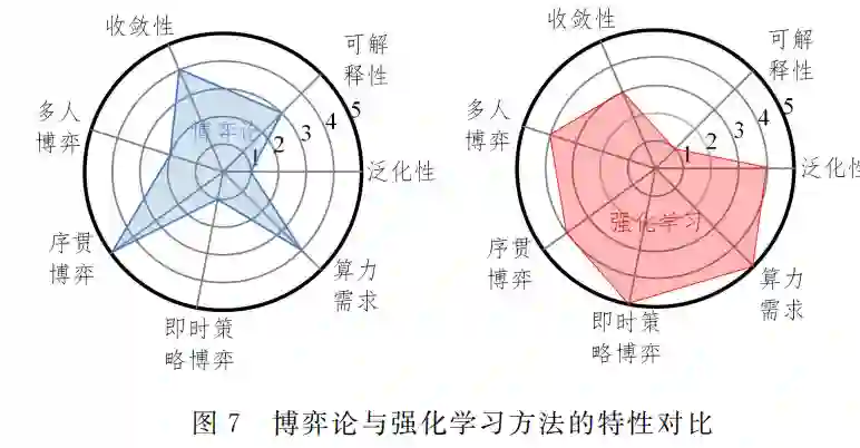 博弈论和强化学习是求解序贯决策问题的有效工具,然 而它们在算法特性(泛化性、可解释性、收敛性保证)、应用场 景(多人博弈、序贯博弈、即时策略博弈)以及硬件资源(算力 需求)等 方 面 各 有 所 长,本 文 总 结 了 近 5 年 AAAI,IJCAI, NeuralPS,AMMAS,ICRL等人工智能顶刊顶会中与智能博 弈技术相关的博弈论与强化学习文章,按专家打分的方法,绘 制对比分析雷达图,如图7所示.博弈理论在两人零和博弈 问题上已经具有较为成熟的理论,包括纳什均衡(以及其他解概念)的等价性、存在性、可交换性(Interchangeability)[39]等, 但在多人博弈问题中还需要新的解概念以及相关理论的支 撑.CFR算法通过后悔值迭代更新生成策略,模型具有可解 释性.但是,完美回放和终端可达的强烈假设限制了 CFR 的 使用场景[92].强化学习结合深度学习,直接实现端到端的学 习,具有很强的泛化性,在多智能体博弈中已取得较多成功应 用.但网络的训练往往需要超大规模的算力支撑,且模型的 可解释性不强.本节将对两种方法的具体局限性进行深入剖 析,为两种方法的结合互补提供方向.