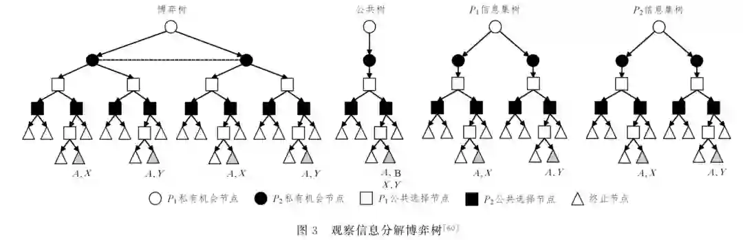 博弈理论和强化学习理论并不互斥,在模型上,博弈论的 扩展式博弈模型和强化学习的部分可观随机博弈两种模型之 间具有一定的联系,例如都可以通过放宽某些条件限制转化 为观察 信 息 可 分 解 的 随 机 博 弈 (FactoredGObservationStoG chasticGames,FOSG)[58].FOSG 是 POSG 的一种扩展性变 体,模型聚焦于公共信息(PublicInformation)的表示和分解, 如图3所示.